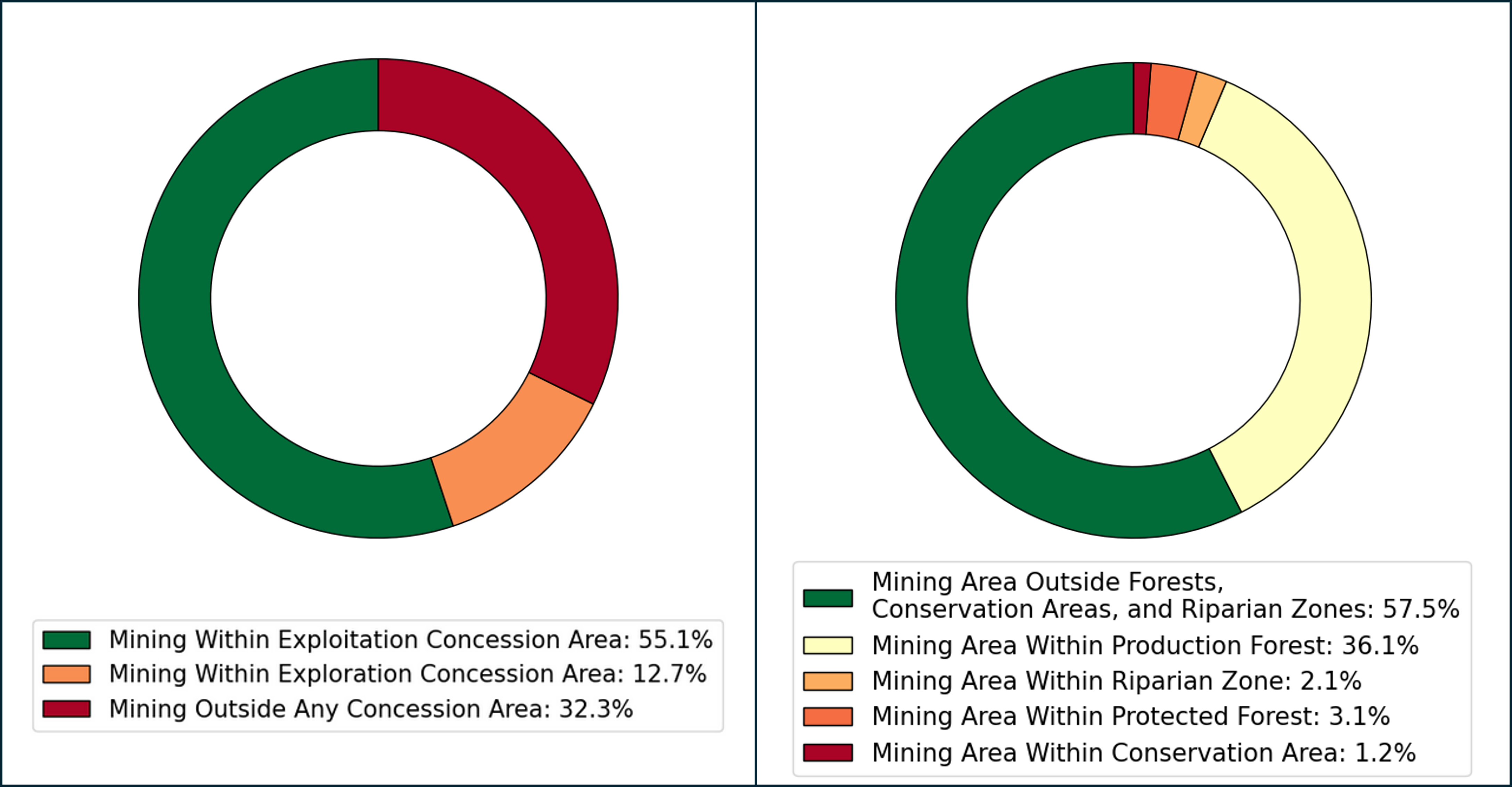 - Located within exploitation concession boundaries but also in protected forests or conservation areas, where mining is strictly prohibited, or