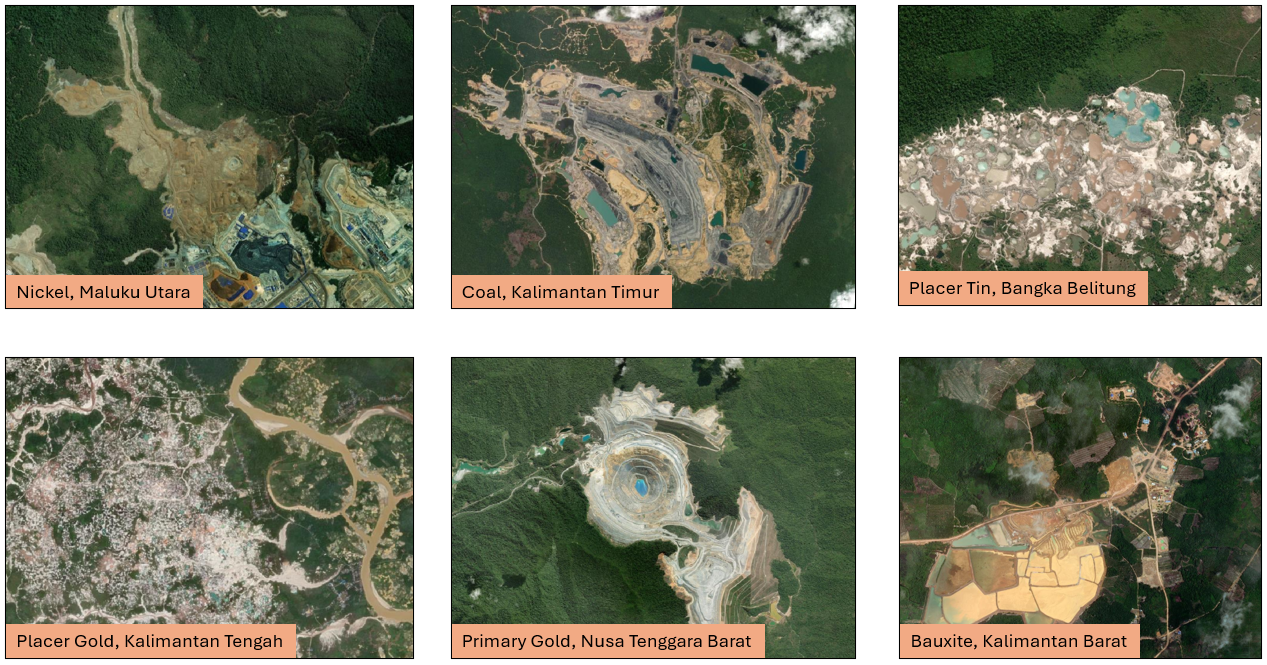 A wealth of information related to mining activities can be obtained from very high-resolution satellite images. The most obvious is the delineation of mining area boundaries. With time-series images, we can observe the development of mining activities and the areas they impact. Less obvious but equally important information includes the type of commodity being mined and the methods used. For those familiar with the mining industry, such details can often be inferred from satellite imagery alone. For example, coal mining can be identified by the black color of coal at the mining front or in stockpiles. Similarly, nickel and bauxite lateritic deposits often have distinct visual characteristics that are easily recognizable from space.